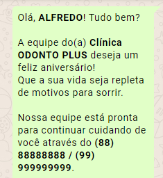 As regras de envio são simples: no dia do aniversário do paciente, ele receberá uma mensagem semelhante à que segue abaixo.