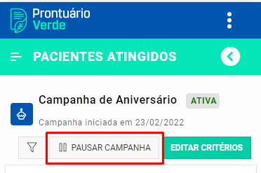 A qualquer momento, você poderá interromper o envio de mensagens de campanhas utilizando o botão “Pausar Campanha”. Se decidir retomá-la, os indicadores de número de mensagens enviadas e todos os dados de acompanhamento serão zerados e reiniciados pelo sistema, caso ele identifique que esta é uma nova execução. O que determina uma nova execução é a campanha ter sido reativada em um dia diferente do qual a mesma foi pausada.