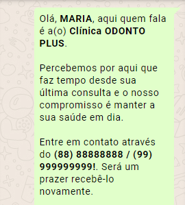As regras de envio são simples: após 6 ou 12 meses do último agendamento o paciente receberá uma mensagem semelhante a que segue abaixo.