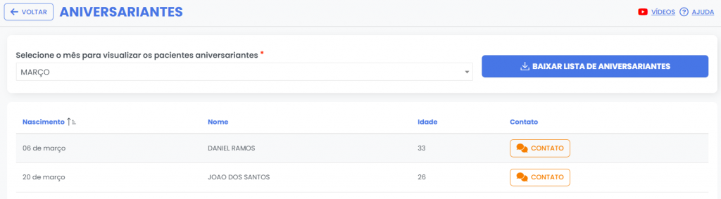 Utilize esta funcionalidade para visualizar todos os pacientes que fazem aniversário no mês selecionado. A partir desta listagem você pode enviar uma mensagem de felicitação, basta clicar no botão “CONTATO”.
