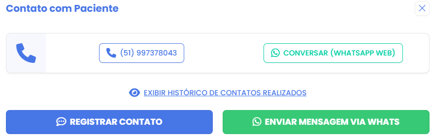 Utilize este botão para realizar e registrar contatos com o paciente, além de acessar o histórico de contatos realizados anteriormente.