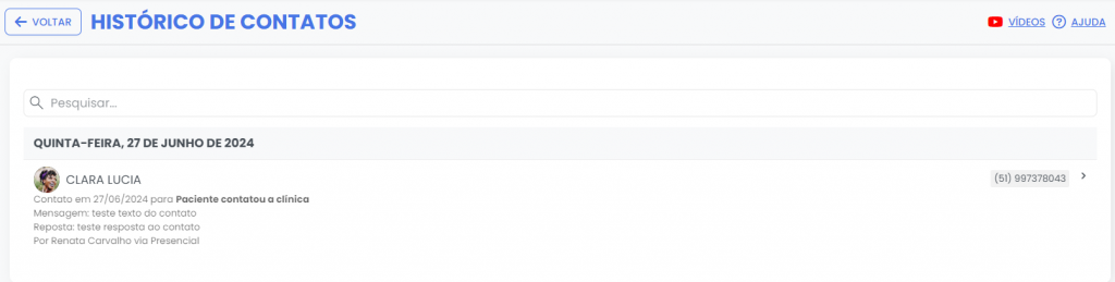 Esta funcionalidade permite visualizar todos os registros de contato com um paciente. É importante ressaltar que para que esta funcionalidade funcione corretamente, todos os contatos devem ser previamente cadastrados manualmente no sistema. Dessa forma, você terá um histórico completo e organizado das interações com cada paciente.