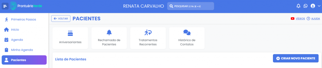 A partir do menu esquerdo você pode acessar a tela de pacientes.