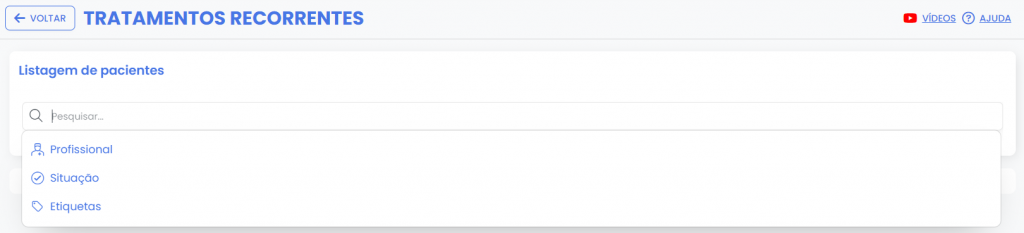 Aqui você encontra a lista de pacientes que estão em tratamentos recorrentes. Esta lista pode ser filtrada por: Profissional, Situação ou Etiquetas.