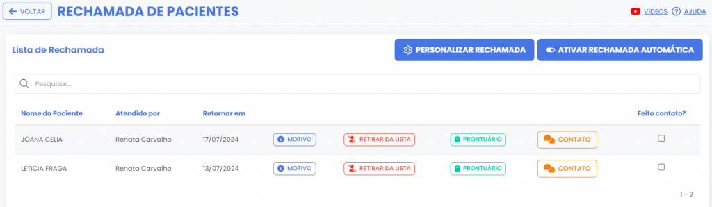 Esta função permite organizar e acompanhar consultas futuras. Após a consulta inicial, os pacientes que precisam retornar são adicionados a uma lista específica de rechamadas. Isso facilita o agendamento do próximo atendimento.