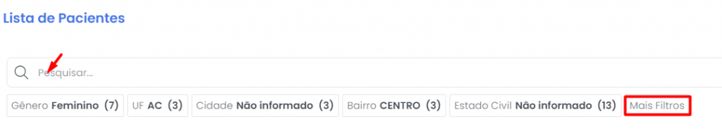 A listagem de todos os seus pacientes possui uma variedade de filtros inteligentes para tornar sua utilização mais eficiente e prática. Diante disso, destacamos a importância de um cadastro completo dos pacientes. O Prontuário Verde já apresenta alguns filtros para a pesquisa, e para ver todos os filtros disponíveis basta clicar em cima da caixa de pesquisa ou no botão “Mais filtros”: