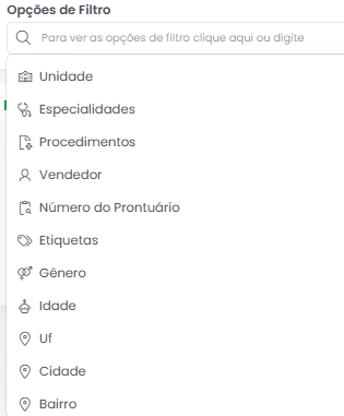 - Especialidades: Filtra pacientes que buscaram atendimento em uma ou mais especialidades oferecidas pela clínica.
