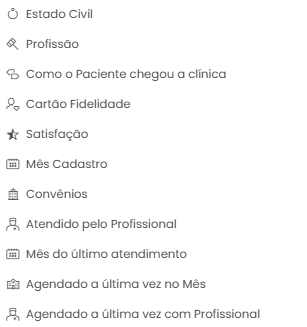- Satisfação: Se sua clínica registra o nível de satisfação dos pacientes (por pesquisa ou avaliação), este filtro permite analisar grupos com diferentes níveis de satisfação.