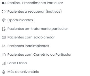 - Pacientes a recuperar (inativos): Um filtro poderoso para identificar pacientes que não agendam há um determinado período, permitindo campanhas de reativação direcionadas.