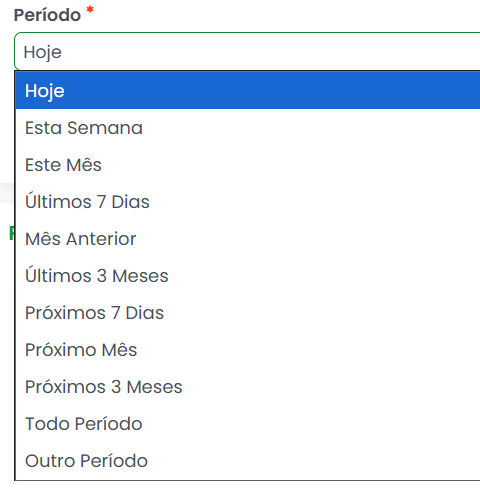 Período: Define o intervalo de datas analisado. Os dados são filtrados conforme a data de criação.