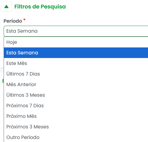 Além desses filtros visíveis, alguns sistemas podem oferecer filtros adicionais, que podem ser acessados em uma área expandida de “Opções Avançadas” ou “Mais Filtros”. Embora não detalhados na imagem específica, filtros comuns em relatórios de agendamento poderiam incluir: