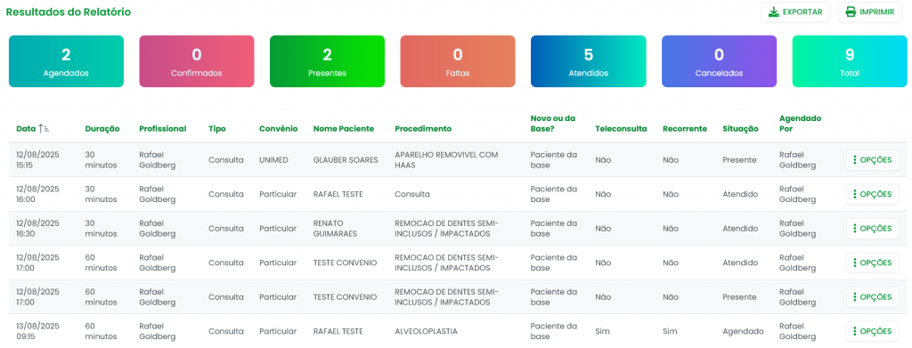 - Profissional: O nome do especialista (ex: Rafael Goldberg) que realizará o atendimento. Permite avaliar a carga de trabalho e a demanda por cada profissional.