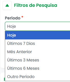 - Período: Define o intervalo de datas analisado. Você pode escolher entre “Hoje”, “Últimos 7 Dias”, “Mês Anterior”, “Últimos 3 Meses”, “Últimos 6 Meses” ou um “Outro Período” específico.