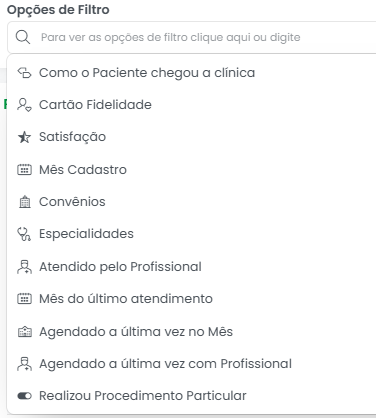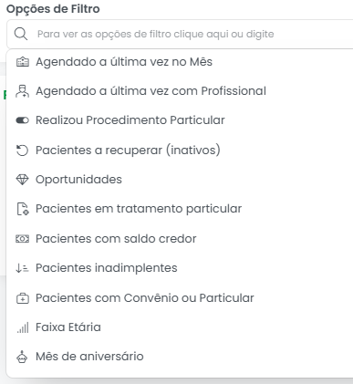 - Mês de aniversário: Filtra os pacientes com base no mês de seus aniversários, ideal para campanhas de marketing ou promoções especiais.