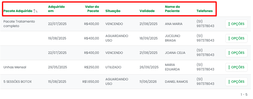- Situação: Filtra os pacotes com base em seu status (por exemplo, “Vencendo”, “Aguardando Uso”, “Utilizado”).