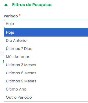 - Período: Define o intervalo de datas analisado, baseado na data de aquisição do pacote. Você pode escolher entre opções como “Hoje”, “Dia Anterior”, “Últimos 7 Dias”, “Mês Anterior”, “Últimos 3 Meses”, “Último Ano” ou até mesmo um “Outro Período” personalizado.