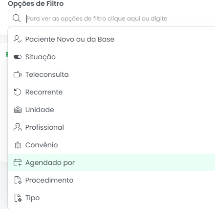 - Agendado Por: Permite filtrar os agendamentos com base no “Usuário do Sistema” que registrou aquele agendamento. Isso é útil para auditorias, treinamentos da equipe e para entender a produtividade dos recepcionistas ou outros funcionários responsáveis pela agenda.