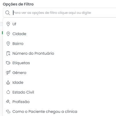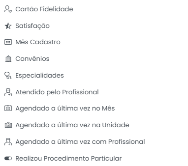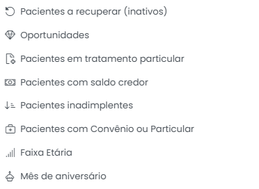 - Mês de Aniversário: Filtra pacientes pelo mês em que fazem aniversário, perfeito para campanhas de marketing personalizadas de aniversário.
