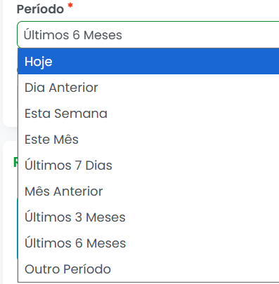 - Período: Este filtro é fundamental para definir o intervalo de tempo que você deseja analisar. Na imagem, vemos a opção “Últimos 3 Meses”, que permite visualizar os resultados acumulados nesse período. Você pode ajustar este filtro para analisar os resultados de outros períodos predefinidos ou personalizar um intervalo de datas específico para focar em dias ou meses específicos. Os dados são filtrados conforme a data do atendimento ou registro.