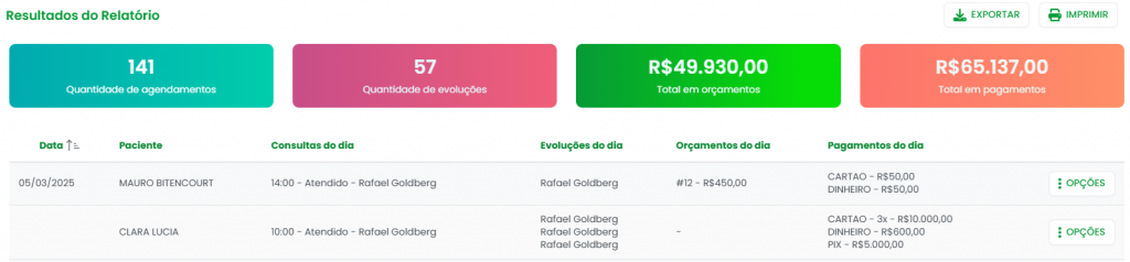 - Pagamentos do dia: Mostra o método de pagamento e o valor total pago no dia para aquele paciente.
